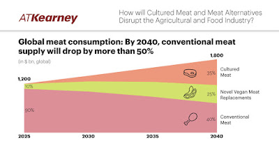 All that may change within a generation. Consulting firm A.T. Kearney, for example, predicts that by 2040 60% of the "meat" most of the world eats will come from meat substitutes.